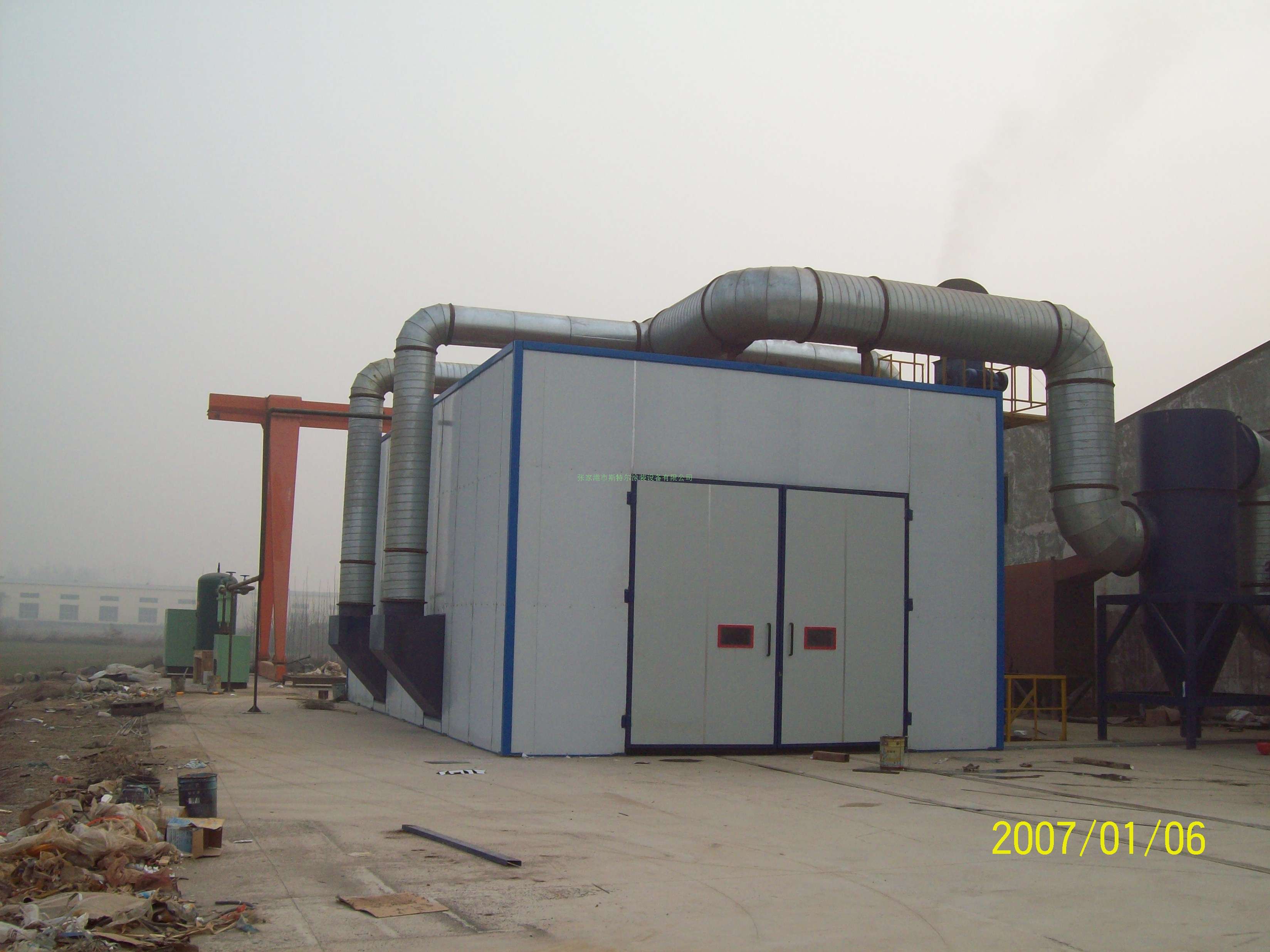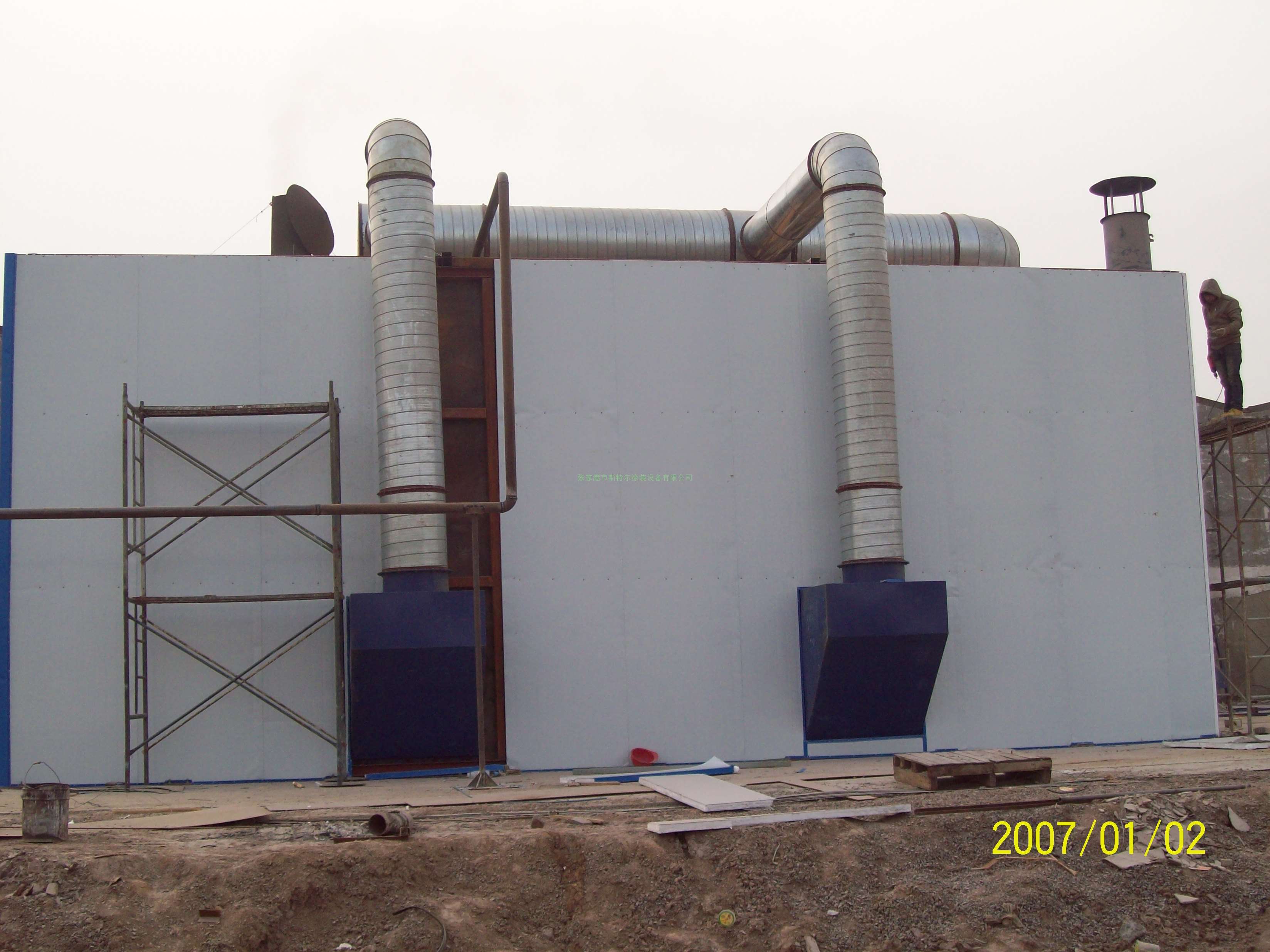 10、喷砂(丸)房室体采用聚苯乙烯发泡塑料夹心彩板房组成,具有消音功能,美观、坚固、密闭。